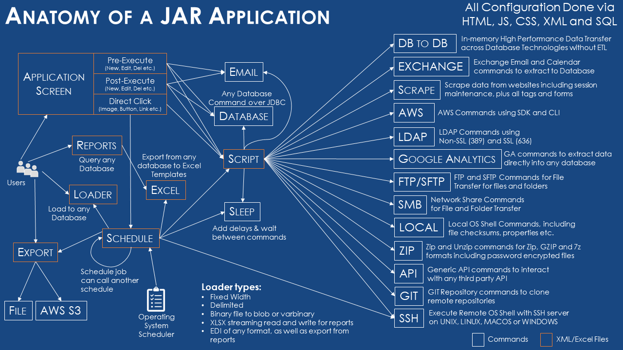 JAR Scheduler Built in dependency based scheduler for everything: Scripts, Loaders, extractors, reporting etc.